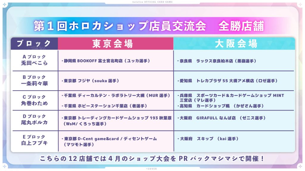 プレイヤーとしてもショップ店員としても日頃よりホロカを応援してくださる皆様に感謝を述べるとともに、これからも『hololive OFFICIAL CARD GAME』の発展にご協力いただけますと幸いです。